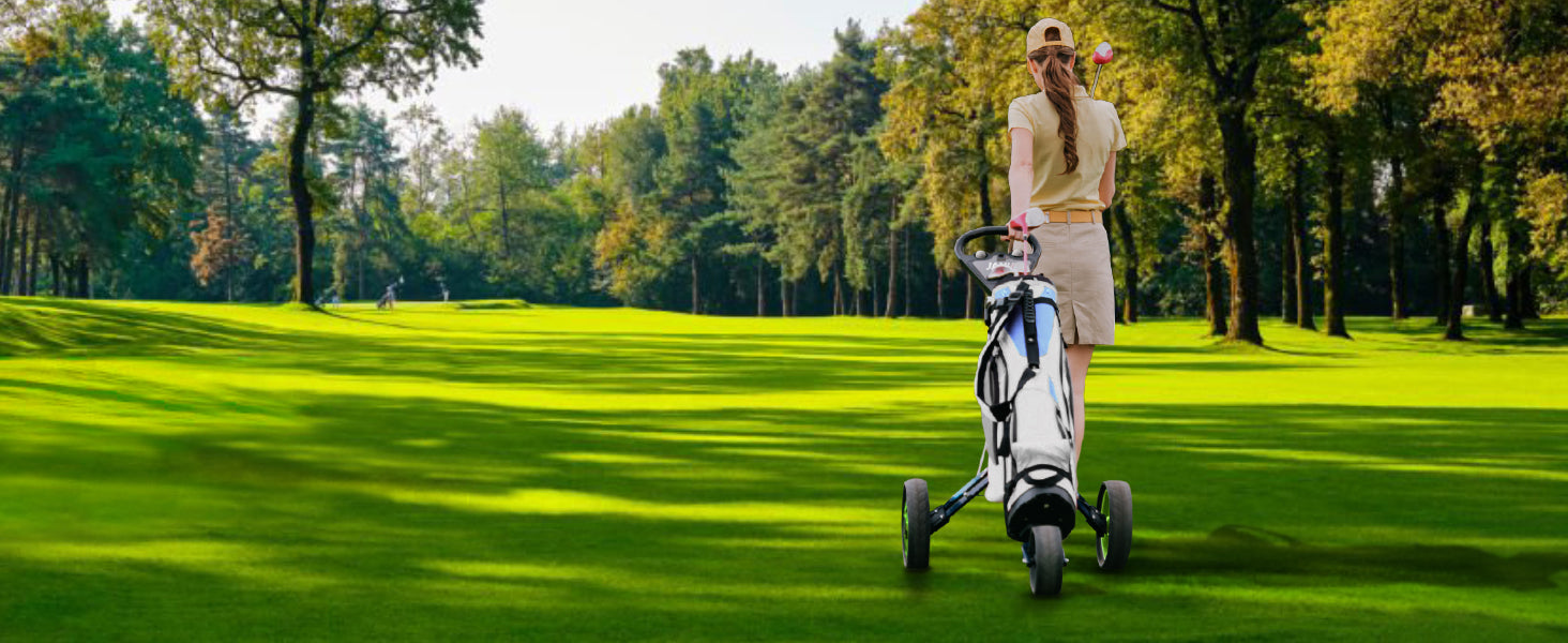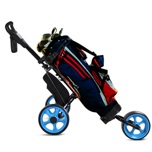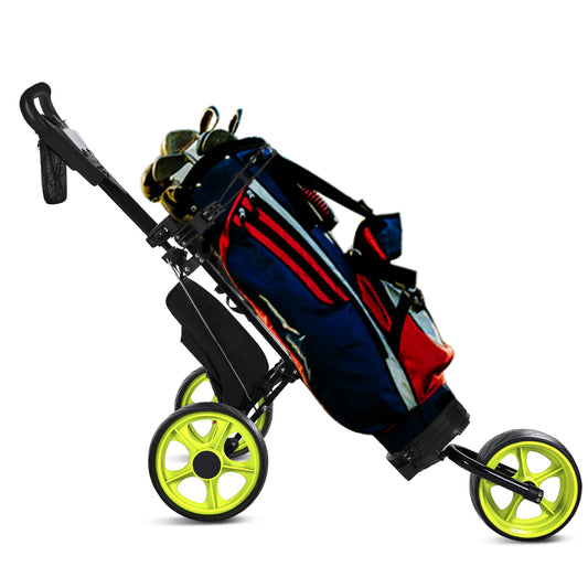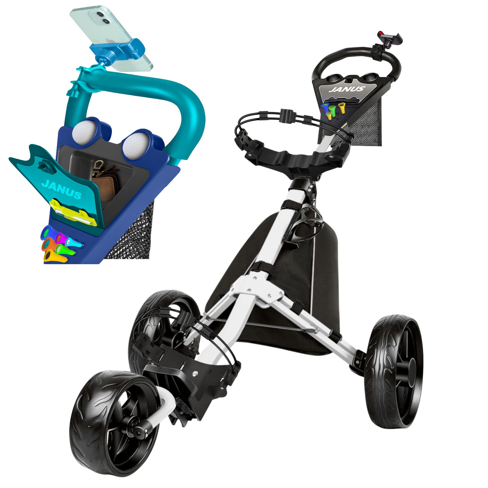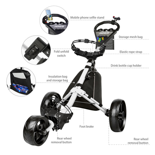 JANUS golf cart, Foldable golf push cart, golf bag cart, golf pull cart with phone holder and storage bag.