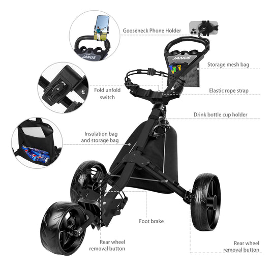 JANUS golf cart, Foldable golf push cart, golf bag cart, golf pull cart with phone holder and storage bag